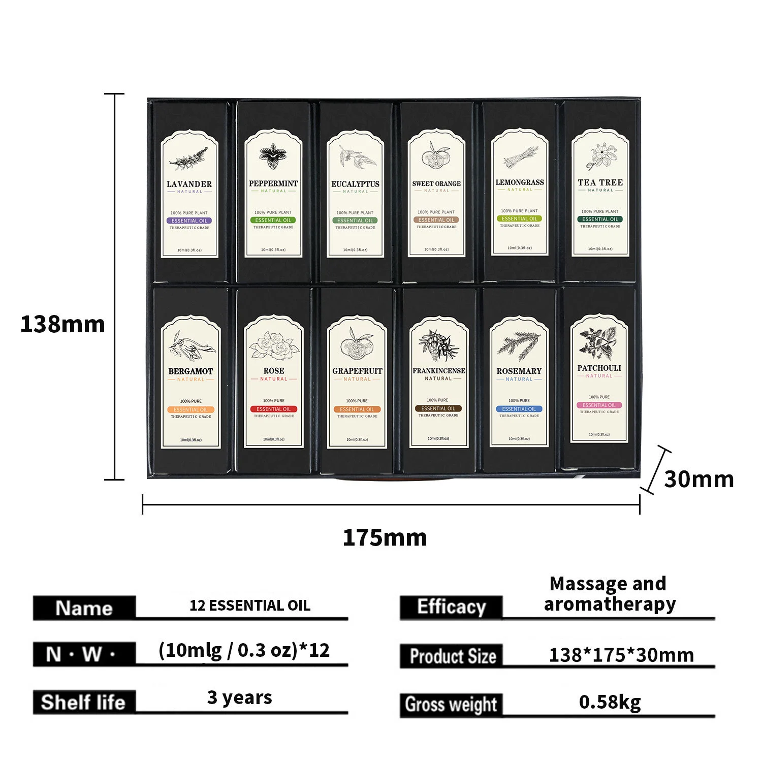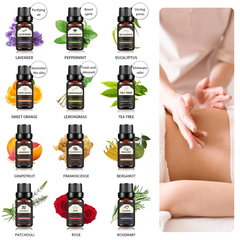 Lavender 10ml, Peppermint 10ml, Eucalyptus 10ml, Sweet Orange 10ml, Lemongrass 10ml, Tea Tree 10ml, Bergamot 10ml, Rose 10ml, Grapefruit 10ml, Frankincense 10ml, Rosemary 10ml, Patchouli 10ml, Jasmine 10ml, Vanilla 10ml, Lemon 10ml, Cherry Blossom 10ml, Ylang Ylang 10ml, Sandalwood 10ml, 6-Pack Set, 12-Pack Set