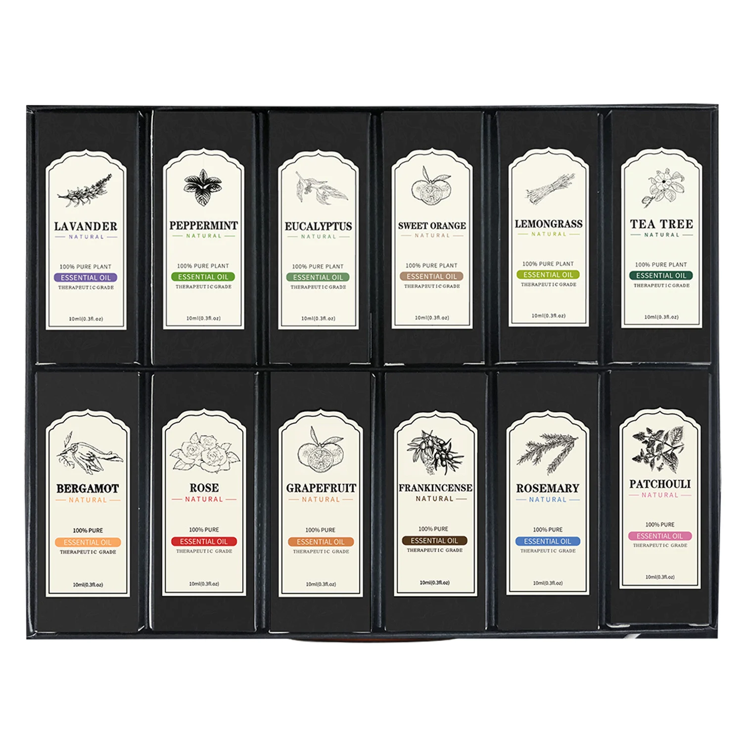 Lavender 10ml, Peppermint 10ml, Eucalyptus 10ml, Sweet Orange 10ml, Lemongrass 10ml, Tea Tree 10ml, Bergamot 10ml, Rose 10ml, Grapefruit 10ml, Frankincense 10ml, Rosemary 10ml, Patchouli 10ml, Jasmine 10ml, Vanilla 10ml, Lemon 10ml, Cherry Blossom 10ml, Ylang Ylang 10ml, Sandalwood 10ml, 6-Pack Set, 12-Pack Set