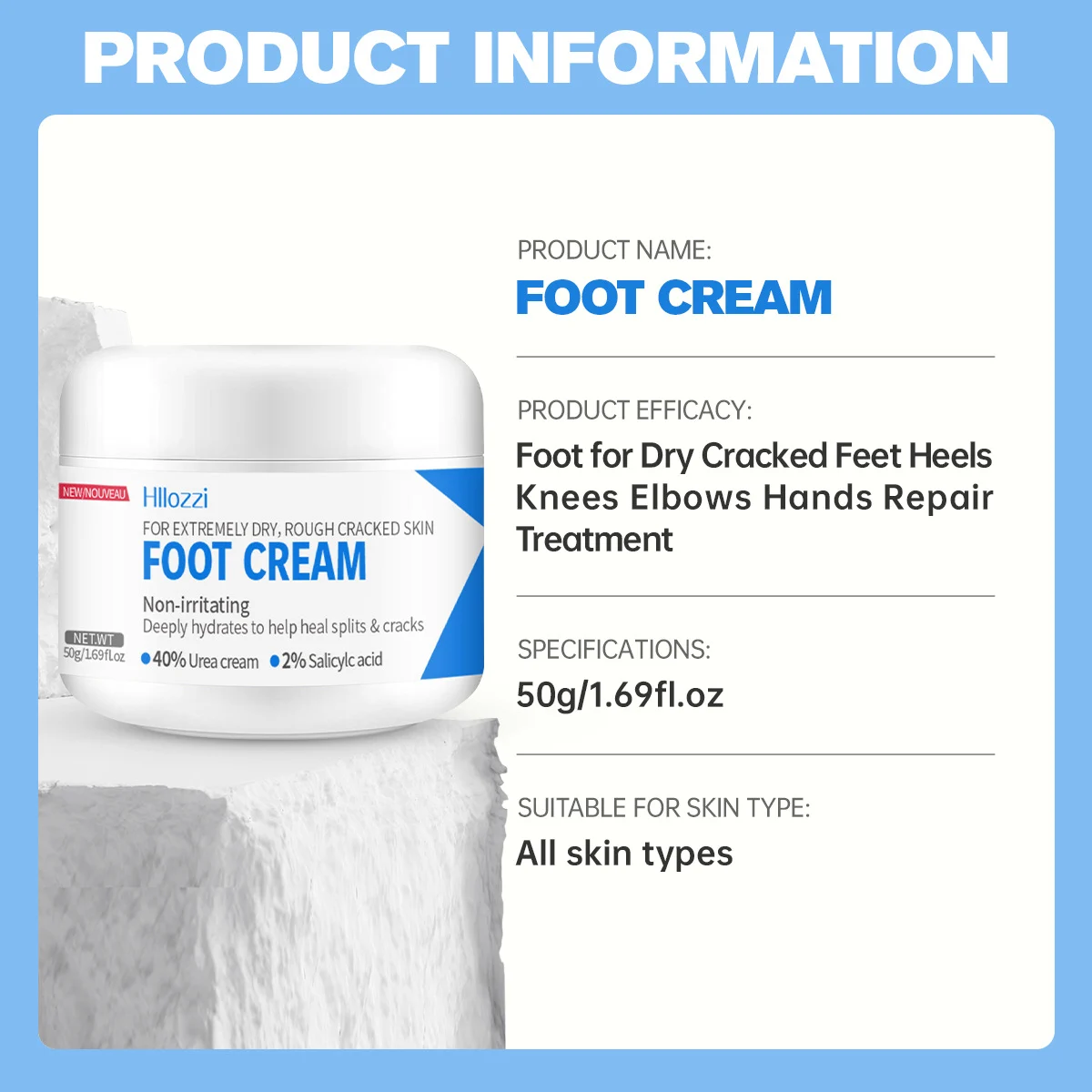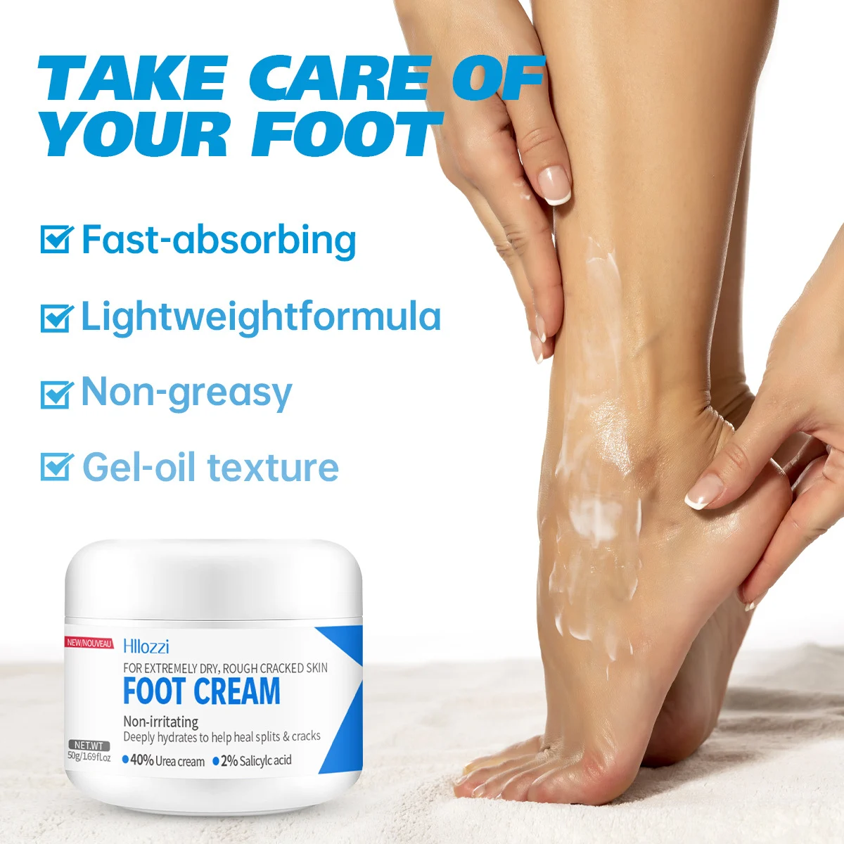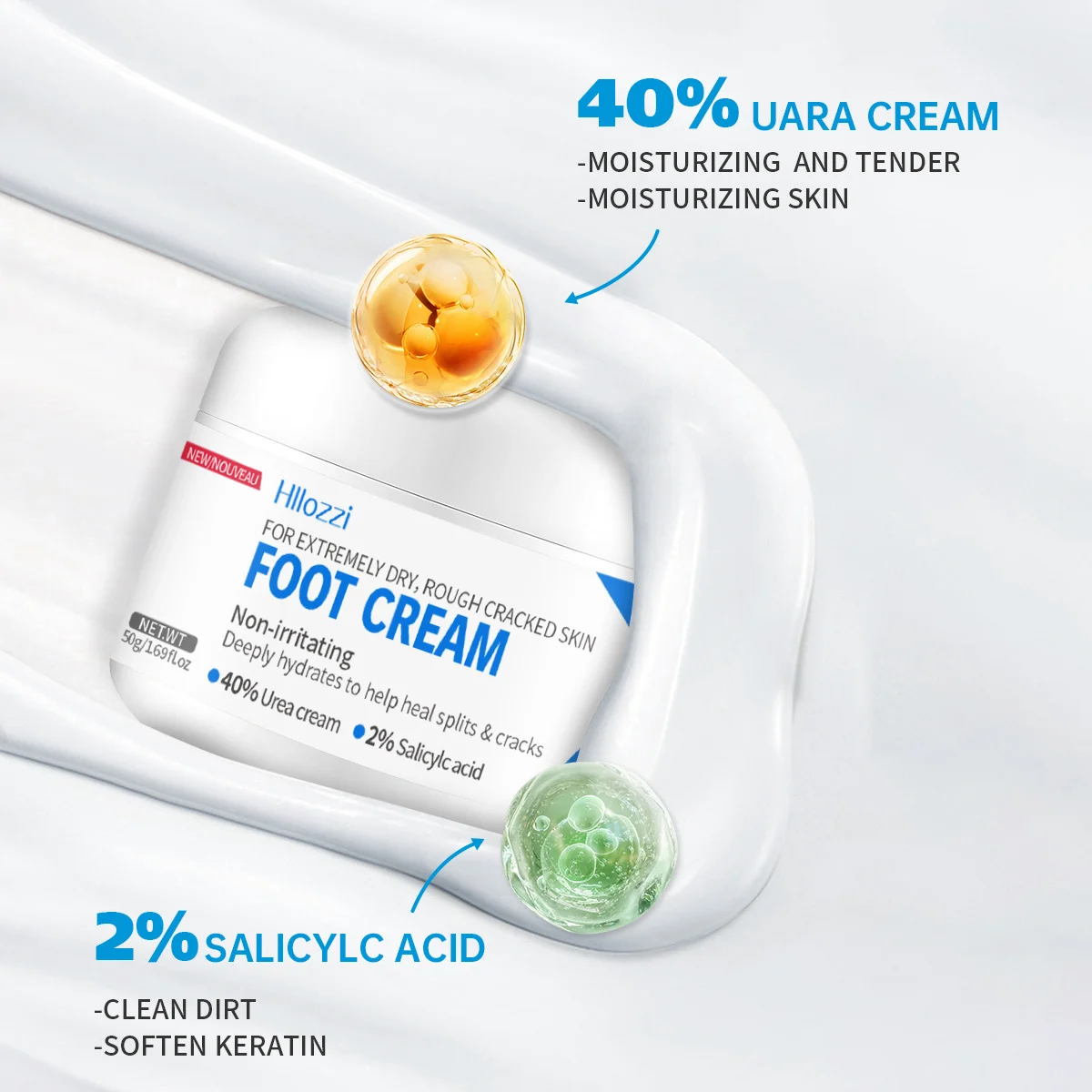 Hllozzi Foot Cream is specially formulated for extremely dry, rough, and cracked skin. Featuring a powerful blend of 40% Urea and 2% Salicylic Acid, it provides deep hydration and intensive repair to restore skin health.