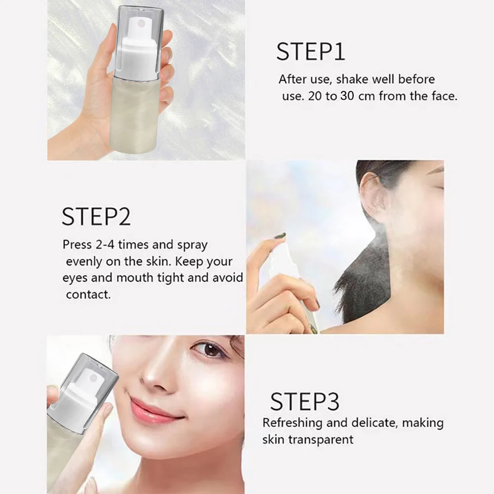 3. Close your eyes and mouth, then press 2-4 times to spray evenly onto the skin.